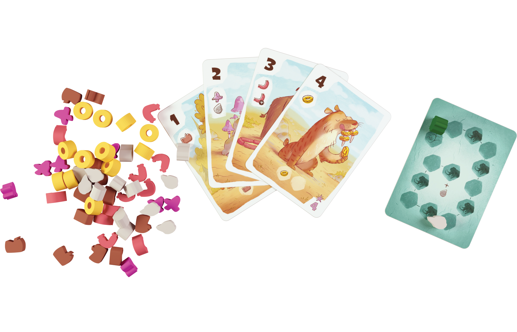 6 starting sets, each with 1 cave card, 4 starting cards, and 1 tribe pawn all in the same color